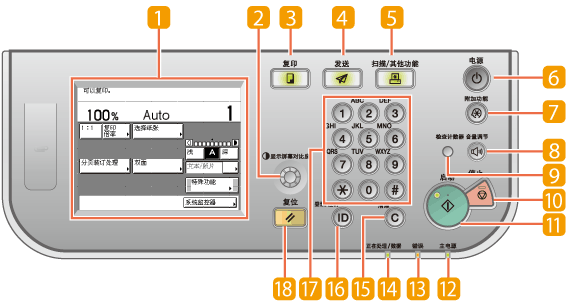 操作面板包括触摸面板显示屏幕、用于各种操作的实体键、数字键和指示灯。