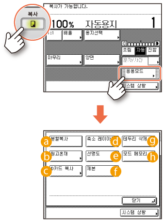 이 절에서는 복사 기능 시작 화면의 [응용 모드]에서 액세스할 수 있는 복사 기능 조작 절차에 대해 설명합니다.