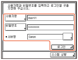 아래 표시된 화면이 나타나면 사용자 이름 및 비밀번호를 입력하고 로그인 대상을 지정한 후 → [로그인]을 누릅니다.
