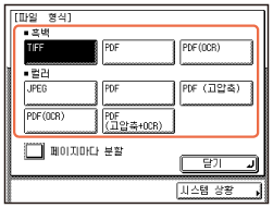 기기에서는 표준 TIFF, PDF 및 JPEG 파일 형식 외에도 PDF(고압축) 및 PDF(OCR) 파일도 지원됩니다.