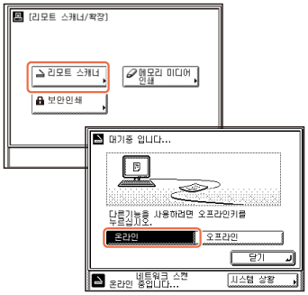 (스캔/옵션)을 누르고 → [스캔/옵션] 화면이 나타나면 [리모트 스캐너] → [온라인]을 누릅니다.