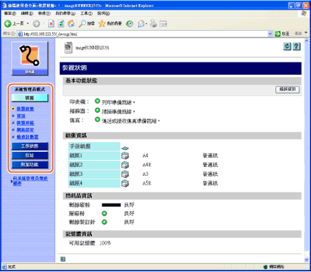 顯示本機器的狀態,如可用記憶體空間、消耗品可用性和錯誤資訊(若有)。若要檢查錯誤的詳細資訊,按一下[錯誤資訊]。