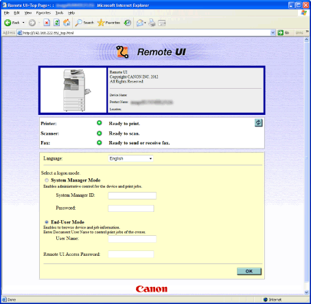 First set the IP (Internet Protocol) address for the machine from the machine’s control panel and set up the necessary network connection. Then start your web browser and enter the IP address of the machine. The Remote UI top page is displayed on your computer screen and is ready for you to log in.