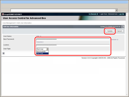 Only the Advanced Space administrator can register/edit the user information on the [User Management] page of [User Access Control for Advanced Space]. General users can only change their own password. (See "Editing User Information by General Users.")