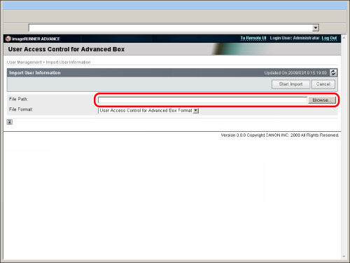 You can store the user information for [User Access Control for Advanced Space] registered in this machine as a file in a computer. This mode is useful when you want to use the user information registered in this machine on another imageRUNNER ADVANCE series machine or to backup the user information.