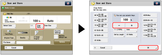 Press [Copy Ratio] → adjust the zoom ratio using [-] and [+] → press [OK].