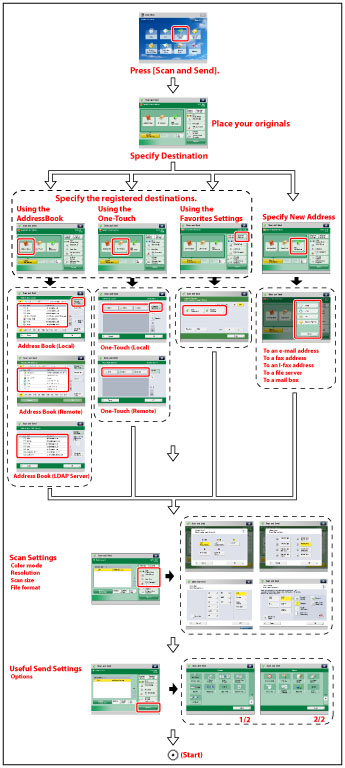 The screen below, which appears when you select [Scan and Send] on the Main Menu screen, is called the Scan and Send Basic Features screen.