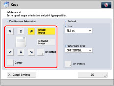 You can also select text that has been registered in [Register Characters for Page No./Watermark]. (See "Registering/Editing/Deleting User-Defined Text for Page Numbers and Watermarks.")