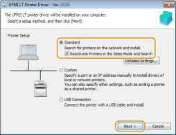 Select [Standard], select the [Reactivate Printers in the Sleep Mode and Search] check box, and click [Next].