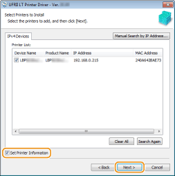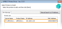 If a printer driver is already installed, the [Select Process] screen is displayed before the [Select Printers to Install] screen. For your printer, the selection made here makes no difference for the setup process. Simply click [Next]. ![]() If the [IPv6 Devices] tab is not displayed