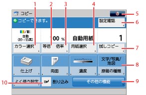 を押して画面を切り替えることができます。この画面にはコピーで利用できる応用機能が表示されます。
