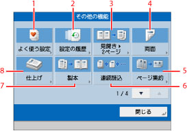 その他の機能のショートカットです。デフォルトでは[仕上げ]、[両面]、[濃度]、[原稿の種類]、[よく使う設定]が設定されています。