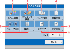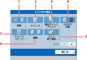 その他の機能を設定します。原稿読込、製本、移動、ページ編集、加工、レイアウト、画像調整などの機能を設定できます。