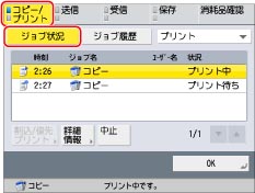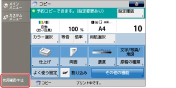 コピー中、または待機中に表示される画面の[中止]を押すと、コピー中のジョブや一番最後に原稿を読み込んだ待機中ジョブを中止できます。