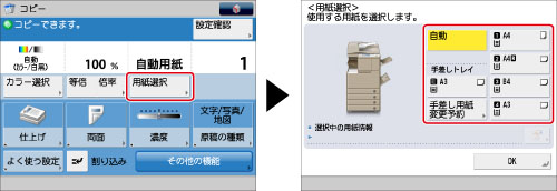 定形サイズ以外の原稿は、自動用紙選択では原稿と同じサイズの用紙が選択されません。コピーする用紙を指定してください。