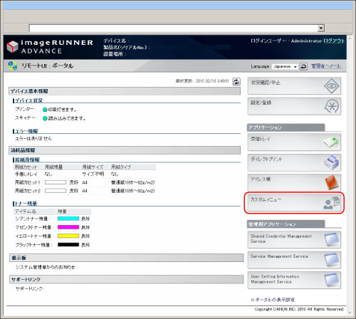 カスタムメニューページの操作は、システム管理者、またはSSO-Hのシステムアドミニストレーター(Administrator)/ネットワークアドミニストレーター(NetworkAdmin)/デバイスアドミニストレーター(DeviceAdmin)が行えます。管理者の種類については、「本製品における管理者設定について」を参照してください。