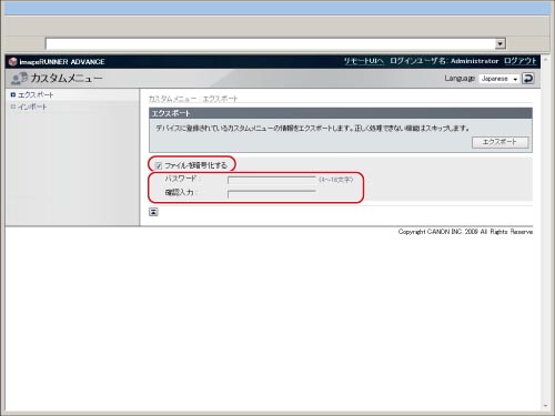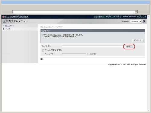 インポートしたファイルの利用は、同一機種グループ間(imageRUNNER ADVANCE C2230F/C2220/C2220F/C2218F-Vシリーズ)で有効です。ただし、オプションの装着状態や使用環境の違いによって、インポートしたボタンを利用できない場合があります。