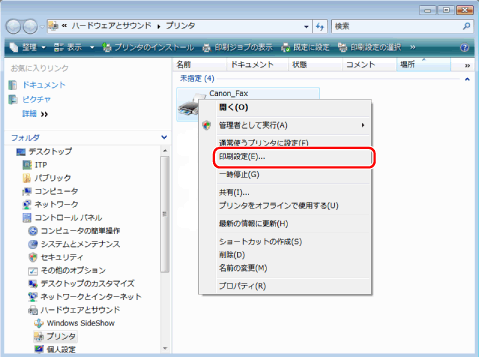 ](スタート)→[コントロールパネル]→[プリンタ]をクリック