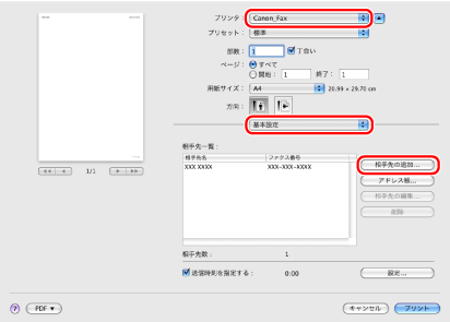 お使いのファクス→[基本設定]を選択→[相手先の追加]をクリック