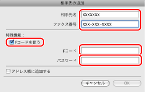 相手先名とファクス番号を入力→[Fコードを使う]にチェックマークを付ける→Fコードとパスワードを入力