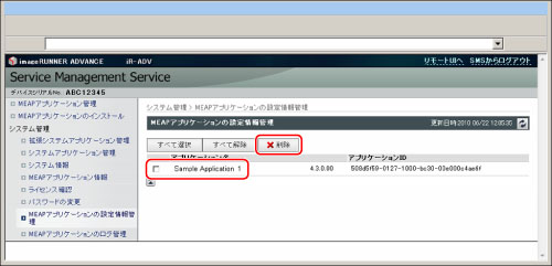 削除するMEAPアプリケーションにチェックマークを付ける→[削除]をクリック