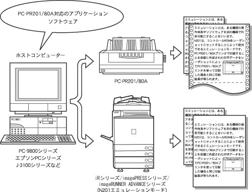 iRシリーズ/imagePRESSシリーズ/imageRUNNER ADVANCEシリーズの動作モードがN201エミュレーションモードに切り替わることによって、PC-PR201/80Aプリンターを使って印字したときと同等の印字を行うことができます。