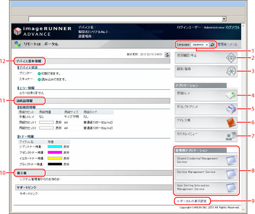 本製品の各種設定を設定/変更できます。一般ユーザーでログインした場合と管理者でログインした場合では、設定/変更できる項目が異なります。(→管理者の設定可能項目一覧(リモートUI))