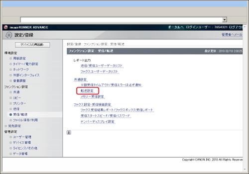 本製品の操作パネル上で、[ファンクション設定](設定/登録)の[受信/転送]→[共通設定]→[転送設定]を押しても、リモートUIからの転送を設定できます。操作パネルから設定する方法、および転送設定の詳しい説明については、「受信/転送」を参照してください。