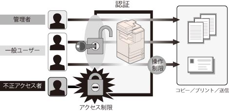 管理者は認証機能を使用することで、一般ユーザーのアクセス制限、操作制限を行い、本製品のユーザーを管理します。一般ユーザーの利用権限は個別に設定できます。また、外部からの不正アクセスを防止することで、本製品の不正操作や情報漏えいを防ぎます。