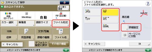 [PDF]または[XPS]を選択した場合、[高圧縮]と[OCR(文字認識)]と組み合わせて設定できます。保存画面では[PDF(高圧縮)]または[XPS(高圧縮)]と表示されます。