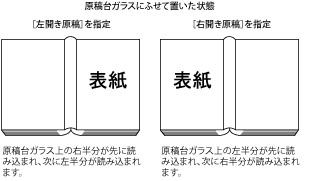 ブック原稿の左右どちらのページから読み込むかを、ブック原稿の開きかたで指定します。原稿台ガラスにふせて置いた状態によって、次のように指定してください。