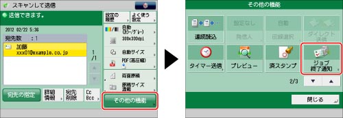 宛先を指定→[その他の機能]→[ジョブ終了通知]を押す