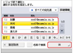 ジョブ終了通知を送る宛先を選択→[OK]→[閉じる]を押す