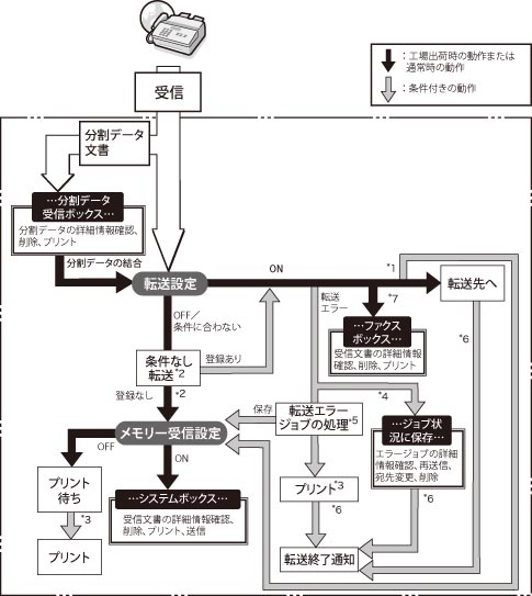 *1 [転送設定]で<受信ファイルの保存/プリント>を「ON」にすると、転送した文書はプリントされるか、システムボックスに保存されます。