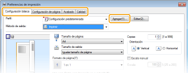 Haga clic en las pestañas [Configuración básica], [Configuración de página], [Acabado] o [Calidad] para especificar las opciones de impresión en cada pantalla según sea necesario.
