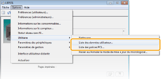 (Papier) de l'appareil pour imprimer une liste des données utilisateur. Affichage des réglages réseauRéglage de la langue d'impressionDans le menu [Options] de la fenêtre du statut de l'imprimante
