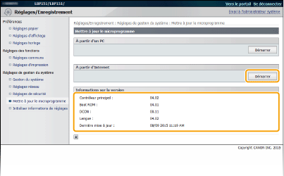 Sélectionnez une méthode de mise à jour du microprogramme en fonction de la manière dont l'appareil est installé. Vérifiez la version du microprogramme de l'appareil et mettez-le à jour via Internet depuis l'appareil ou depuis un ordinateur sur lequel le microprogramme est téléchargé.