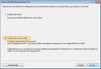 Après avoir remplacé la connexion par réseau sans fil par une connexion par réseau filaireVous devez désinstaller le pilote d'imprimante en place, configurer la connexion au réseau filaire puis réinstaller le pilote d'imprimante conformément à Manuel d'installation du pilote d'imprimante. Lors de la configuration de la connexion au réseau filaire, sélectionnez [Configuration personnalisée] comme méthode de configuration.