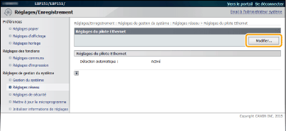 Ethernet est une norme pour la communication des données dans un réseau. Vous pouvez définir le mode de communication (Semi-duplex/Duplex intégral) et le type d'Ethernet (10BASE-T/100BASE-TX). Le réglage par défaut d'usine, le mode de communication et le type d'Ethernet sont automatiquement détectés. Généralement, les réglages Ethernet peuvent être utilisés tel quel, mais vous pouvez aussi procéder comme suit pour configurer manuellement ces réglages.