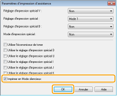 ![]() Impression silencieuseSi le bruit de l'imprimante vous dérange, vous pouvez le réduire en utilisant le mode Silencieux. Notez que l'impression en mode Silencieux est plus lente.