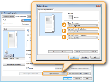 Sélectionnez la position d'impression de la date d'impression, du nom d'utilisateur ou du numéro de page