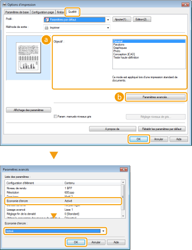Vous pouvez définir le pilote d'imprimante afin d'imprimer les documents en utilisant moins d'encre.