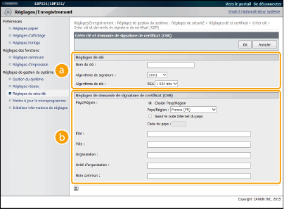 Il est possible de générer une paire de clés avec l'appareil lorsque cela est nécessaire pour une communication cryptée via Transport Layer Security (TLS). Ou pouvez utiliser TLS lorsque vous accédez à l'appareil via l'interface utilisateur distante. Il est possible d'enregistrer jusqu'à cinq paires de clés, y compris les paires de clés préinstallées. Des certificats auto signés sont utilisés avec les paires de clés générées dans "Communication réseau". Avec une "Demande de clé et de signature de certificat (CSR)", vous pouvez demander un certificat numérique émis par une autorité de certification pour la paire de clés générées par l'appareil.