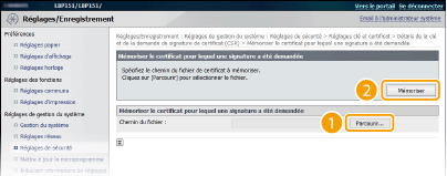 Cliquez sur [Parcourir], spécifiez le fichier pour la demande de signature de certificat et cliquez sur [Mémoriser].