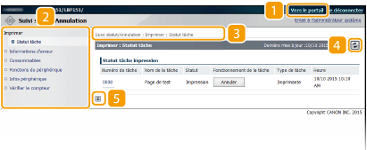 Permet d'afficher la page [Suivi statut/Annulation]. Vous pouvez utiliser cette page pour vérifier l'état de l'imprimante, annuler l'impression et consulter l'historique des tâches d'impression.