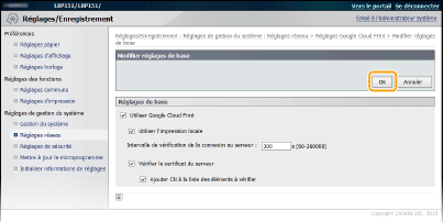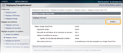 Vous devez activer Google Cloud Print. Cliquez sur [Modifier], cochez la case [Utiliser Google Cloud Print], puis cliquez sur [OK].