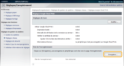 Pour la procédure d'enregistrement, consultez le mode d'emploi de votre périphérique mobile ou le site Web de Google Cloud Print.