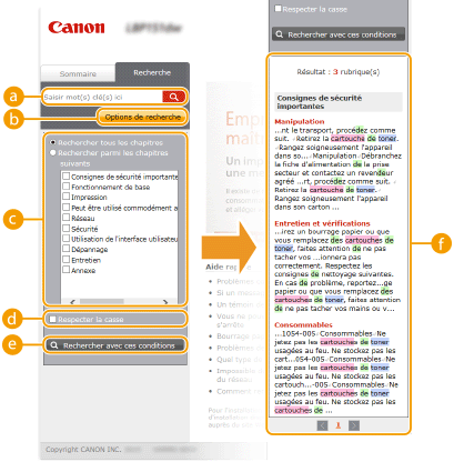 Cliquez pour faire basculer l'affichage entre l'onglet [Sommaire] et l'onglet [Recherche].