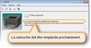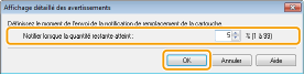 Vous pouvez définir la quantité d'encre restante dans la cartouche de toner (en %) pour afficher le message par incréments de 1 %. Le réglage par défaut est configuré sur 10 %.