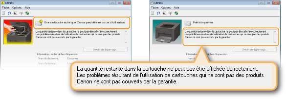Si vous continuez l'impression lorsque <Une cartouche autre que Canon peut être en cours d'utilisation> est affiché, cliquez sur